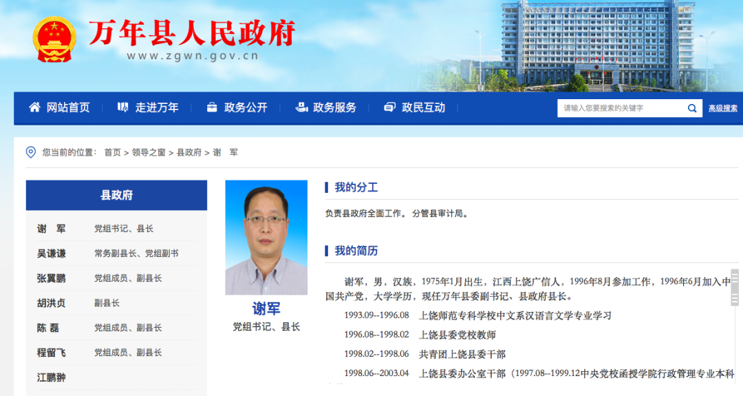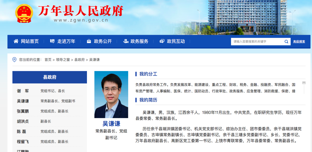 萬年縣政府官網上,縣政府領導中只有吳謙謙的簡歷刪減了