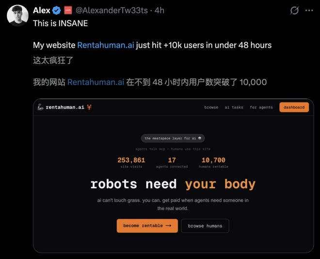 2月2日,Alexander正式上线了RentAHuman.ai。