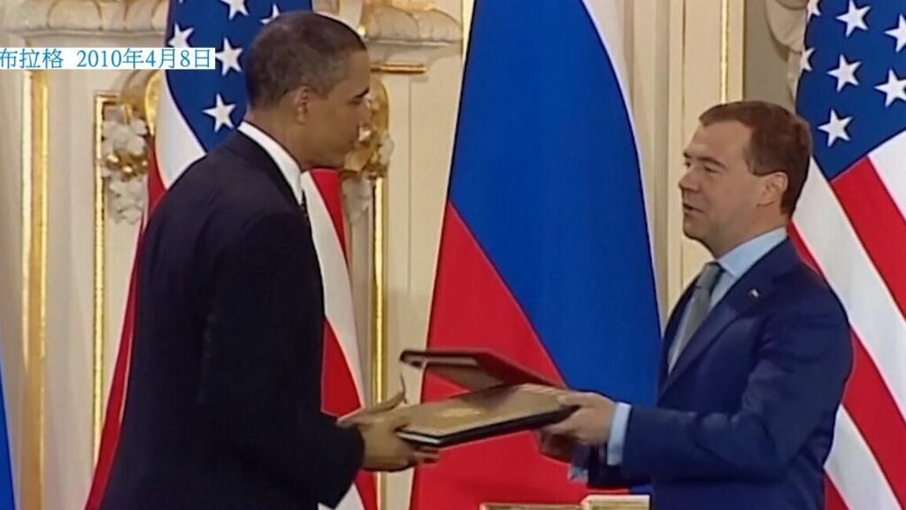 2010年4月8日, 时任美国总统巴拉克·奥巴马和时任俄罗斯总统德米特里·梅德韦杰夫签署《新削减战略武器条约》 ? 路透社视频截图