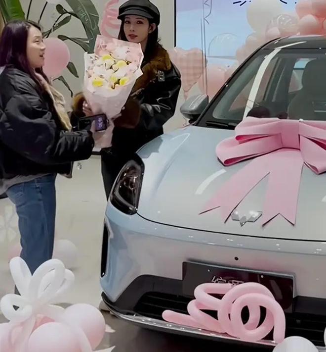 虽然7万块的小轿车,但是品牌方依然给她安排了一个很温馨的提车仪式。白色的小汽车装点了粉色蝴蝶结,还有粉白色的气球,准备了一束粉色鲜花。