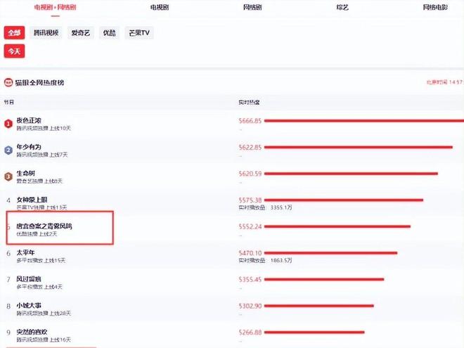 热度数据方面,《唐宫奇案之青雾凤鸣》暂居榜单第五,《成何体统》位列第十。