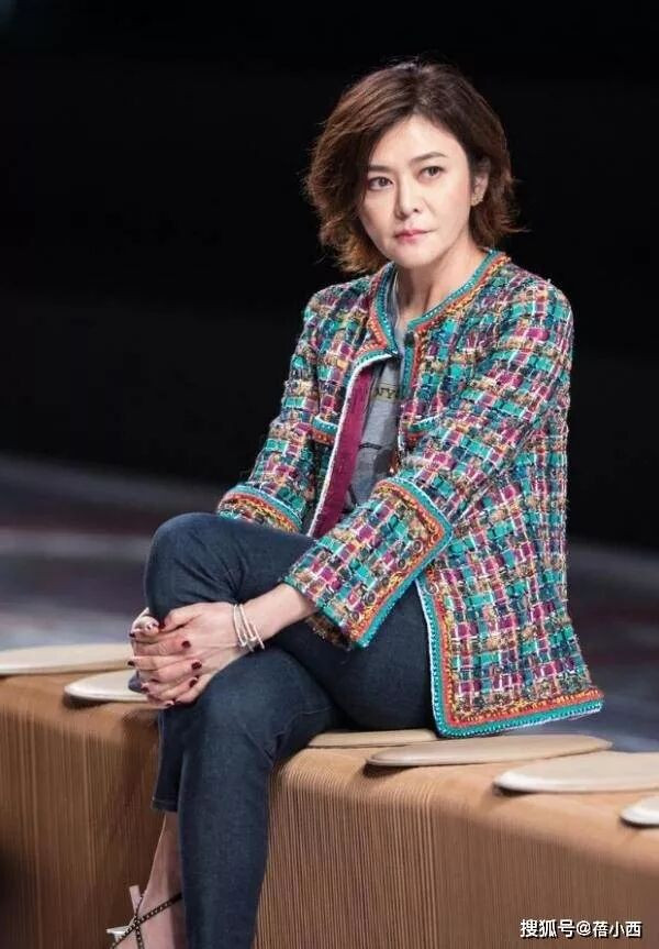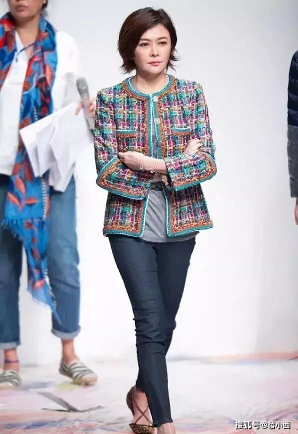 为了不抢走外套的风头,关之琳选择了灰色圆领 T 恤作为内搭。低饱和度的底色起到了很好的中和作用,让整体造型在绚烂之余保持了呼吸感。下身搭配的深色牛仔裤更是点睛之笔,修身裤型拉长了腿部线条,牛仔面料的休闲感与粗花呢的奢华感形成巧妙碰撞。这种 “上繁下简” 的搭配思路,完美诠释了松弛感穿搭哲学。没有刻意堆砌大牌单品,也没有用力凹造型,却通过色彩与材质的平衡,让整体造型既华丽又日常,成熟女性也能轻松驾驭。