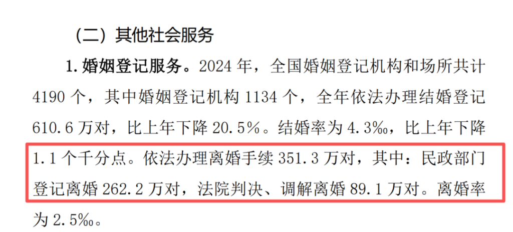 比如说,民政部发布的《2024年民政事业发展统计公报》显示,2024年依法办理离婚手续351.3万对,其中法院判决、调解离婚89.1万对。