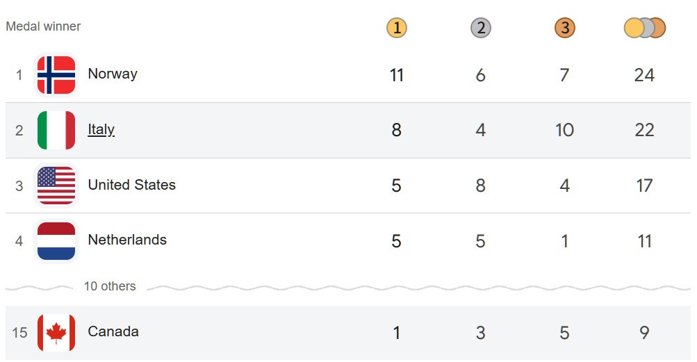 周日,加拿大隊在米蘭科爾蒂納冬奧會上以一金、三銀、五銅暫時位列排行榜第十五位。
