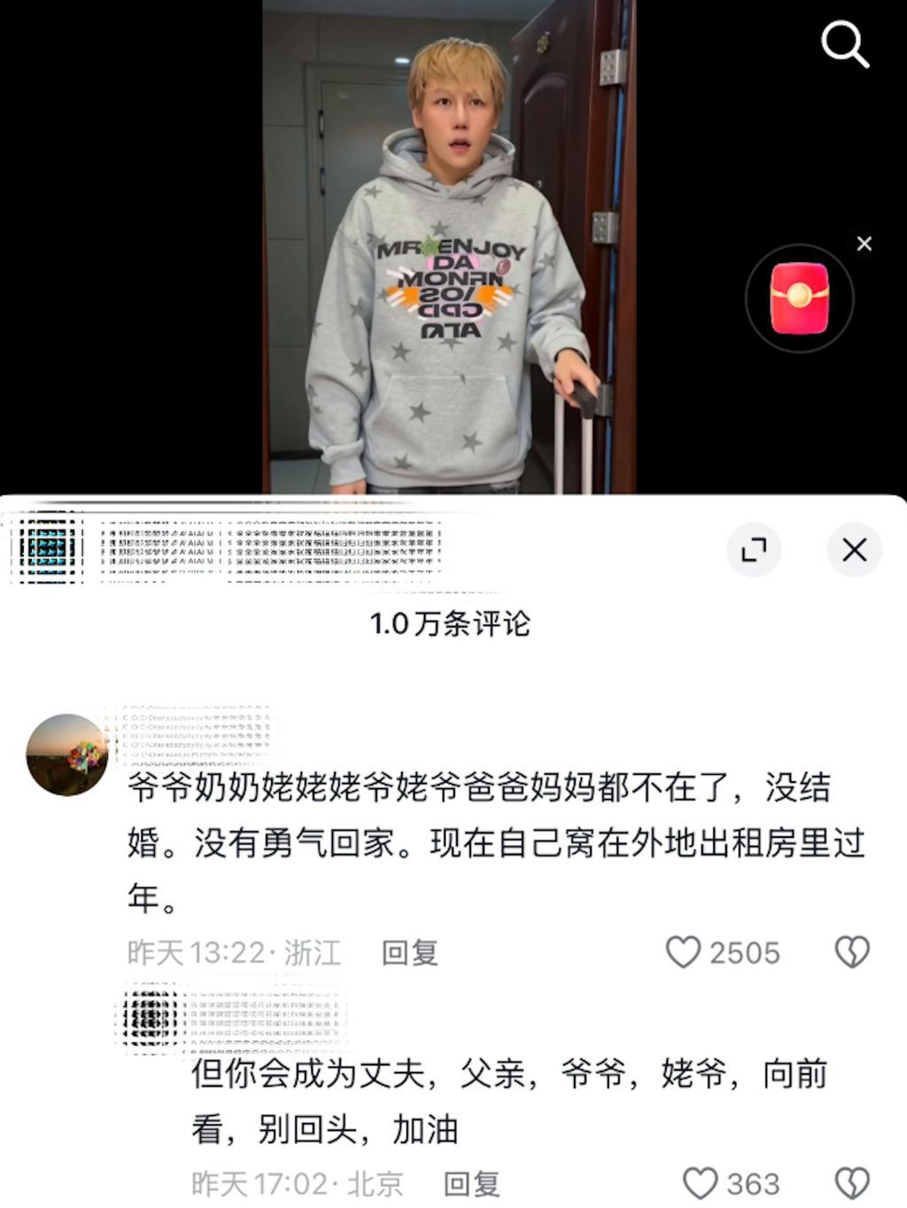 評論區內,不僅是對劉維的心疼,也有許多網民在互相取暖、互相安慰,「逝去的親人在天堂陪著你,不要覺得孤單,要一直快樂」、「我們都是媽媽身上掉下的肉,我們活著,媽媽就活著」、「你會成為丈夫、父親、爺爺、姥爺,向前看,別回頭,加油!」