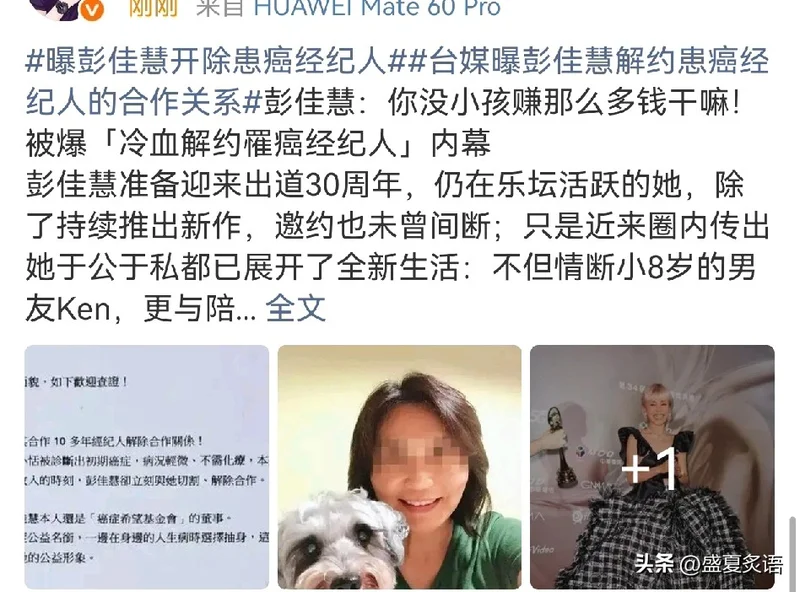 25日,彭佳慧突然沖上熱搜,她不僅開除相伴10多年的患癌經紀人,說出的話更寒心:“你又沒有小孩,賺那麼多錢幹嘛”。