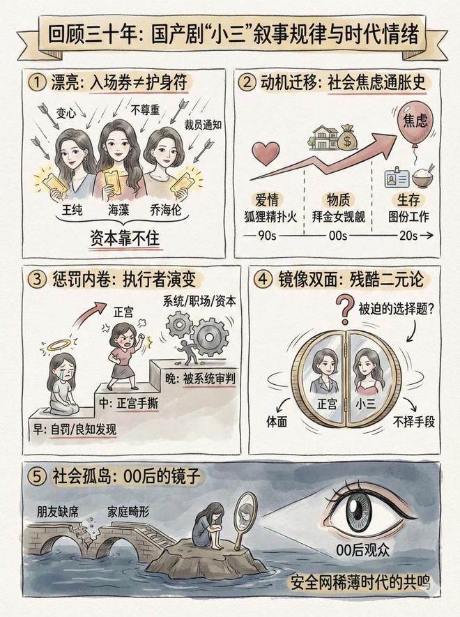 從虛無縹緲的愛情至上,到物欲橫流的拜金主義,再到僅僅只是為了生存,成為小三的動機,映射了整個社會的變遷。小三形象的逐步“降級”,實質暗合了觀眾側的普遍焦慮升級。