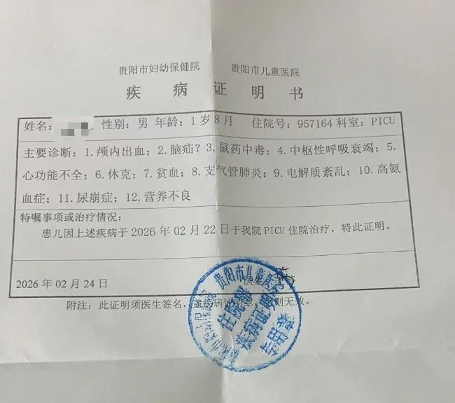 贵阳市妇幼保健院出具的疾病证明书显示,小言被诊断为颅内出血、脑疝、鼠药中毒、中枢性呼吸衰竭、心功能不全、休克、贫血、支气管肺炎、电解质紊乱、高氨血症、尿崩症、营养不良等。该院此前出具的病危通知书写明,小言病情危重,随时可能进一步恶化。周先生悲痛地告诉大皖新闻记者,小言目前仍在ICU处于昏迷状态,靠呼吸机维持生命,且鼠药中毒的后续治疗难度极大,并发症随时可能夺走孩子的生命。