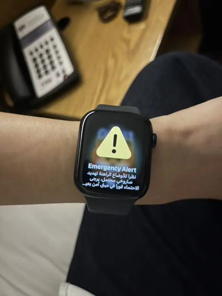 当天夜里,手机警报一共发布了三次。在迪拜,我的手机无法拨打和接听任何电话。当意外接到电话的那一刻,我以为是家人在想尽办法联系我,但很显然我错了。电话接通后,手机开始振动,然后是哔哔的响声,再然后弹出了黄色的导弹袭击警告。