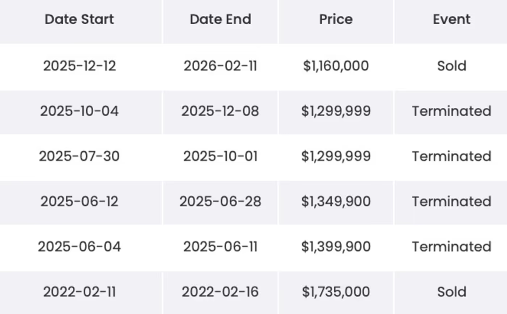 这栋房子最初于2022年2月以173.5万加元的价格售出,当时该地区房价飙升,需求旺盛。在接下来的几年里,这栋房子多次重新挂牌出售,价格也随之变化,其中包括2025年6月两次挂牌,价格分别为略低于140万加元和134.9万加元;2025年7月挂牌,价格略低于130万加元;以及同年10月再次挂牌,价格与2025年7月相同。