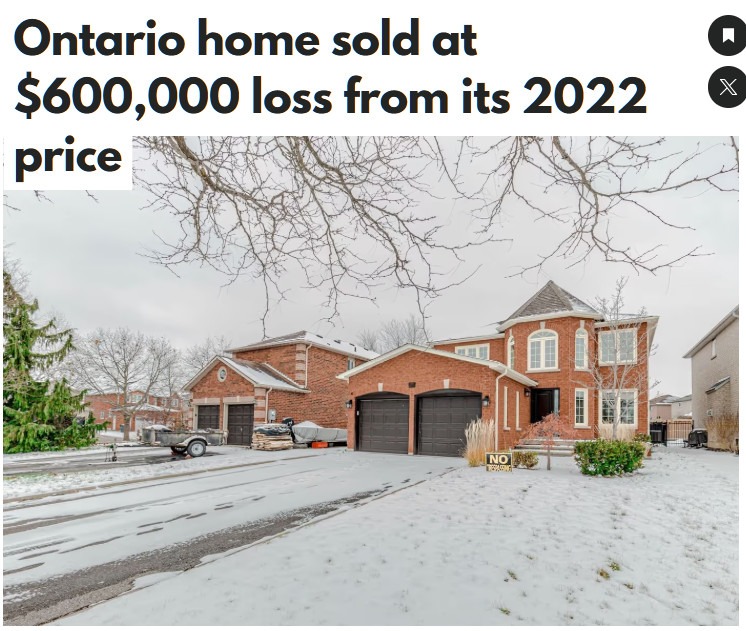 安省卡利登的一栋独立屋为例,该房子在本月初以比 2022 年原价低近 60 万加元的价格售出。