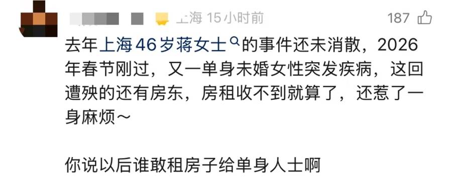 鄧女士的遭遇像一面鏡子,照出了無數獨居者的隱憂。網友的留言,句句扎心:這種問題只會越來越多,年輕人也需要多考慮一步了。