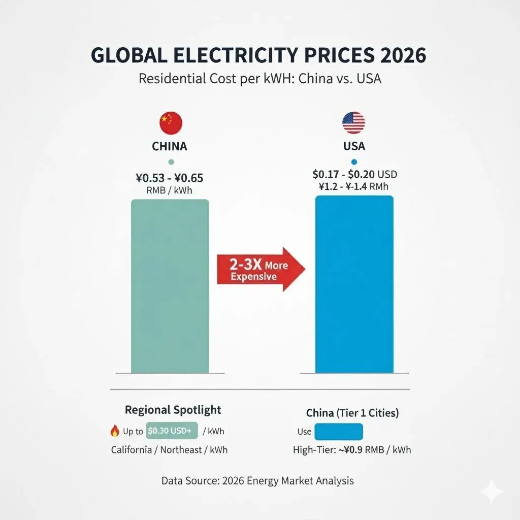 美國來說,普通居民用戶用電價格明顯比中國貴。2026年全美居民平均電價約為 0.17 - 0.20 美元/度(約 1.2 - 1.4 元人民幣(专题)),幾乎是中國平均水平的 2 到 3 倍。在加州(专题)或東北部(如麻省、紐約(专题)),居民電價甚至可能高達 0.30 美元/度以上。