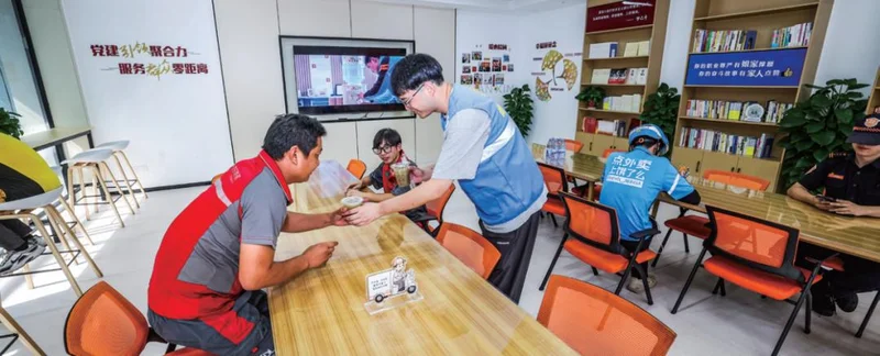 2025年8月26日,浙江省嘉兴市,南湖区工会志愿者在工会驿站为休息的外卖骑手送上绿豆汤等清凉饮品。图/新华