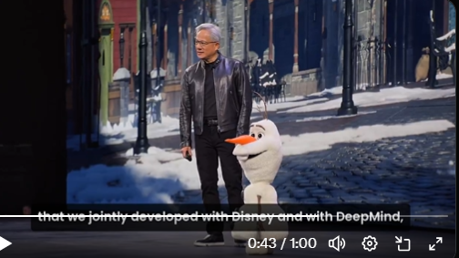 在演讲接近尾声时,一个机器人版的雪宝(Olaf)——迪士尼(Disney)《冰雪奇缘》(Frozen)系列动画中的雪人角色——缓步走上舞台。这个机器人由英伟达、DeepMind和迪士尼合作打造,它与黄仁勋进行了一段略显生硬的对话,话题围绕英伟达的Omniverse部门展开,该部门专门为机器人等设备开发物理AI产品。