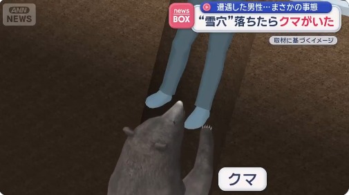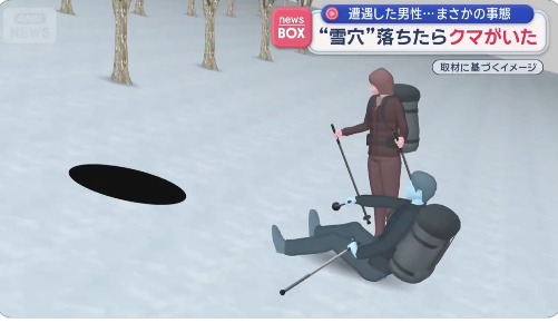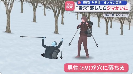 当时男子不慎踩入被积雪覆盖的洞穴中,他下滑至腰部位置。令人意外的是,洞穴内正有一只正在冬眠的熊。