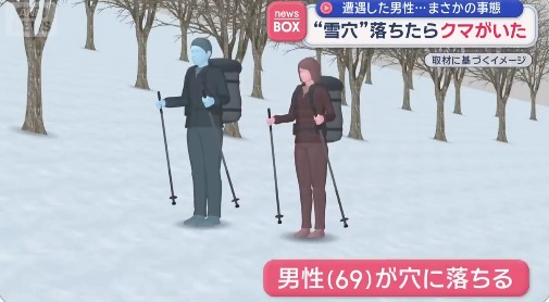 (加西网综合)当地时间3月8日上午,日本一名69岁的男子在岩手县岩神山徒步登山时,意外掉入一只冬眠熊的洞穴中,所幸最终脱险,伤势轻微。