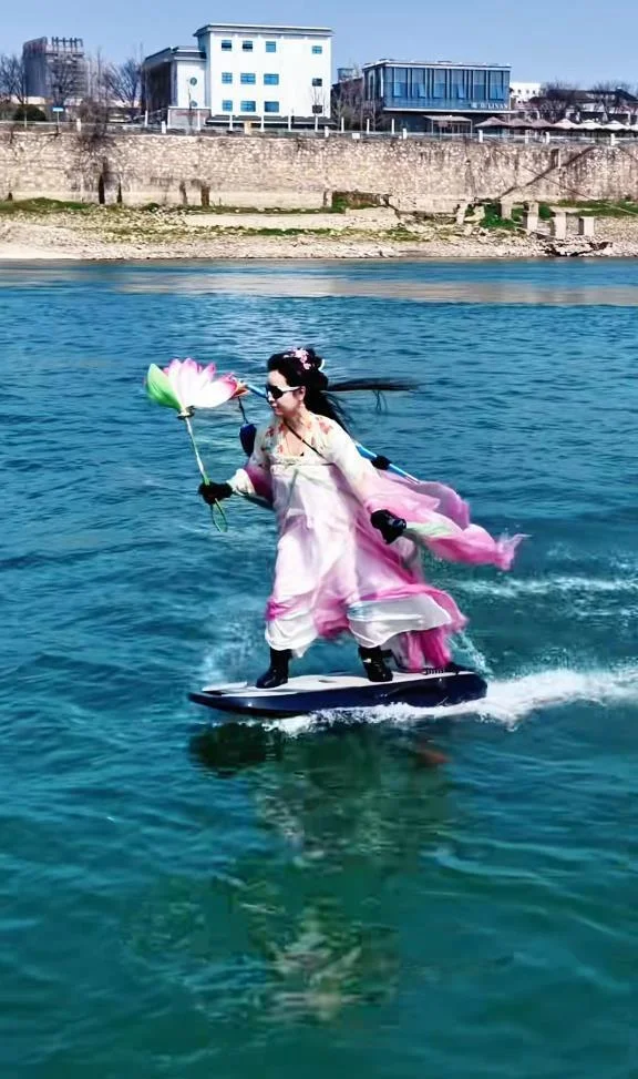 這波操作可不是特效。3月14日,視頻主角胡帆女士親自下場回應,揭開了這場“仙俠奇觀”的幕後故事。原來,這“御劍飛行”的功夫,靠的是一項現代科技與古典情懷的混搭——水翼板。而這位“江上女俠”,是個癡迷漢服八年的資深愛好者,收藏了五六十套服飾。
