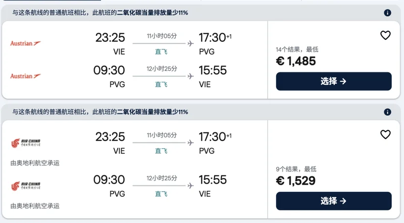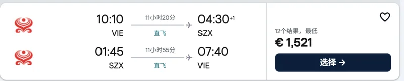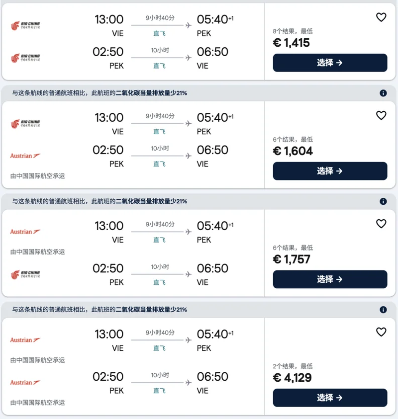 近期從維也納往返中國的經濟艙機票最低價格都已經在1400歐元以上。