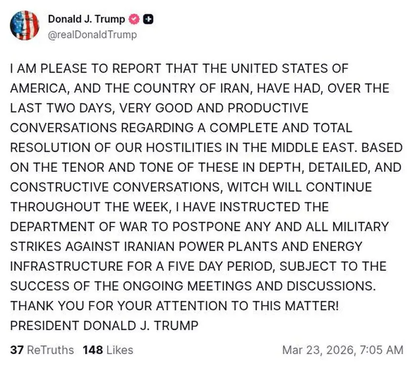 从更广的市场背景来看,川普当天的表态本身就足以成为重大价格触发器。此前,美国总统曾就霍尔木兹海峡问题向伊朗发出强硬警告,市场担忧美方可能直接打击伊朗能源与电力系统,从而进一步推高原油价格并拖累全球风险偏好。川普随后改口称,将把针对伊朗能源基础设施的打击推迟5天,并表示美伊之间进行了“非常好且富有成效”的沟通,尽管伊朗方面否认存在直接接触。