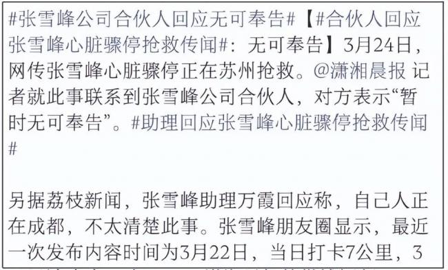 消息出来后,有媒体致电了助理和合伙人。张雪峰助理仅表示人在成都,不太清楚此事;张雪峰合伙人则表示“暂时无可奉告”。而且,记者致电张雪峰本人,电话无人接听,情况看起来并不乐观。