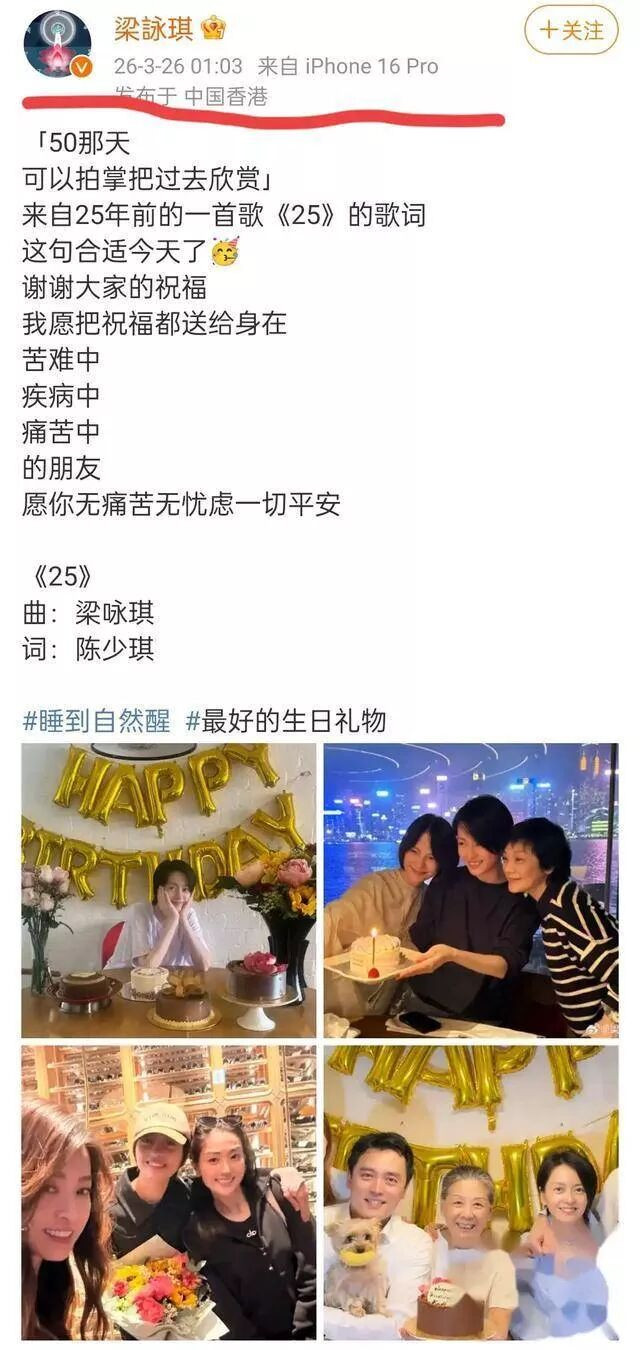 50岁梁咏琪凌晨晒庆生照 龙凤胎弟弟罕露面