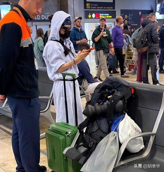 这一趟长途飞行,她没有带助理帮忙打理一切,而是自己推着两个巨大的行李箱,背上还背着两个鼓鼓囊囊的大包裹,远远看去就像背着一座小山。