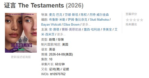Hulu的现象级大剧《使女的故事》官方衍生续集。剧集改编自原着作者玛格丽特·阿特伍德的同名小说。