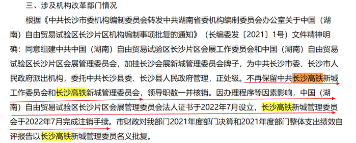 不再保留中共长沙高铁新城工作委员会和长沙高铁新城管理委员会,领导职数一并核销。因办理程序等因素影响,中国(湖南)自由贸易试验区长沙片区会展管理委员会法人证书于2022年7月设立,长沙高铁新城管理委员会于2022年7月完成注销手续。