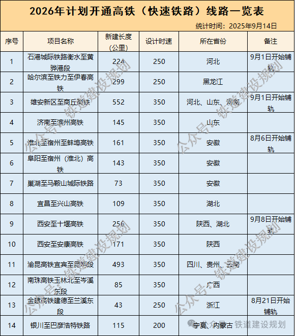2025开通12条高铁线路,2026年预计将有14条高铁路线开通。