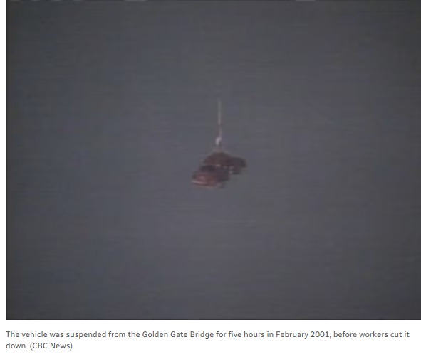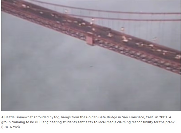 2001年,一輛甲殼蟲汽車在霧氣的籠罩下懸掛在加利福尼亞州舊金山的金門大橋上。一群自稱是UBC工程系學生的人向當地媒體發送傳真,聲稱對此事負責。