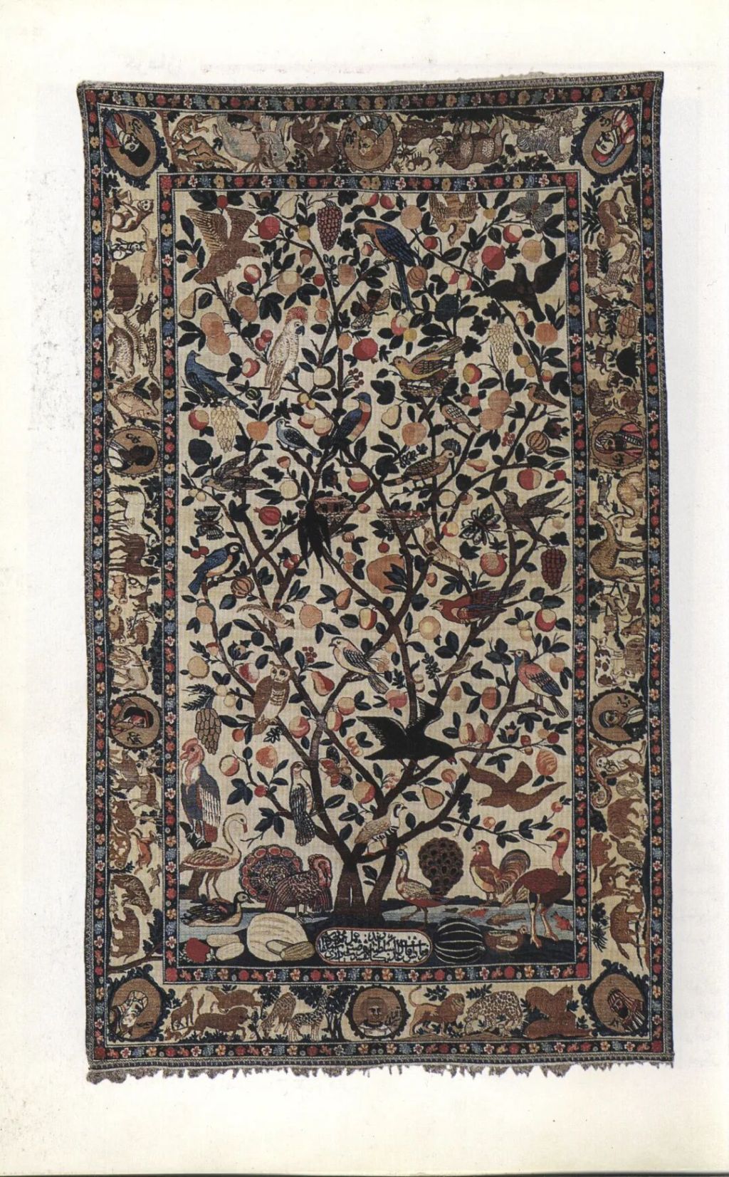 我们还展示了两块地毯,其中一块上绣着黄道十二宫和相关的动物符号,环绕着波斯语、阿拉伯语和察合台语(用阿拉伯字母书写的一种突厥语言)等三种文字。另一块地毯的四周绣着不同人种的头像,其中就有中国的回鹘人。波斯诗人萨迪的诗句“亚当子孙皆兄弟,兄弟犹如手足亲”里流露出的跨种族博爱,在这块地毯上得到了体现。