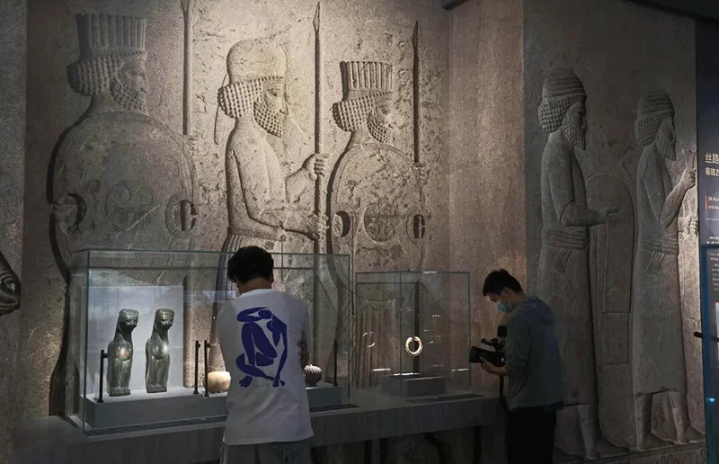 2025年7月,一批伊朗文物在南京博物院展出,展柜后的背景是波斯波利斯遗址的浮雕图案(图源:视觉中国