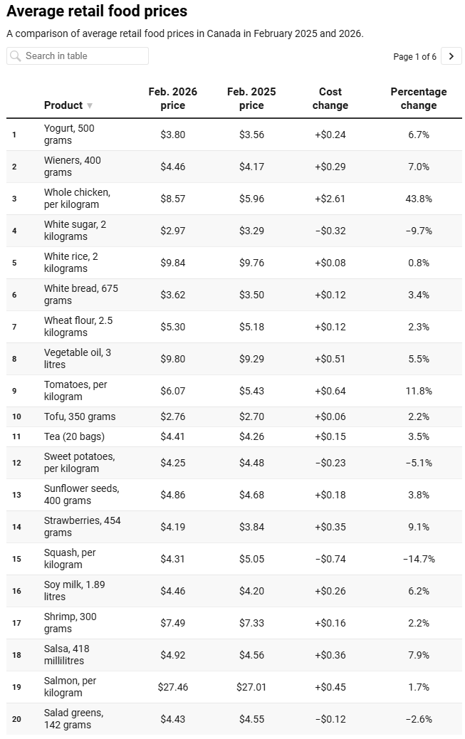 加拿大統計局數據顯示,2026年2月食品價格同比上漲5.7%,明顯高於同期整體通脹(1.8%)。