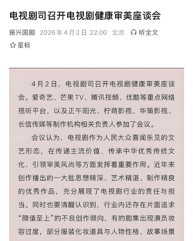 好在,这回监管层是真开口了。4月2日,广电总局开了电视剧健康审美座谈会,话讲得一点不绕:批评片面追求“颜值至上”的创作倾向,点名那种妆容过度、服化道跟人物和场景脱节的问题。古装剧里厚粉武将,现代剧里全天候精致妆,年代剧里劳动者没一点粗粝感,都被拎出来说了。