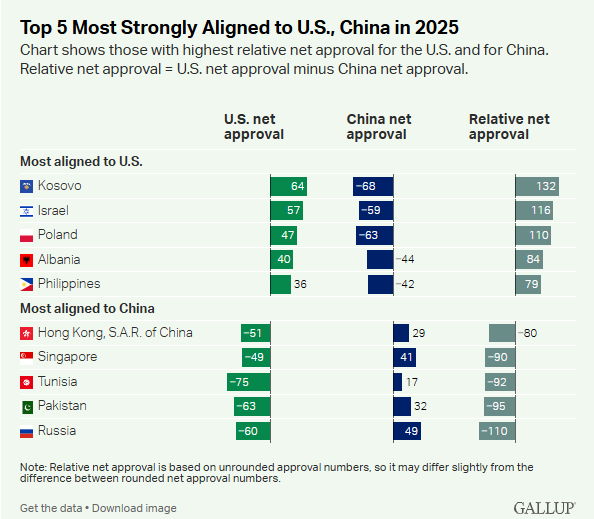 德国在2025年以48%的认可度位居第一,并且在盖洛普连续九年的排名中保持最受欢迎大国地位,跨越默克尔、朔尔茨和弗里德里希·默茨三任总理。其后依次是中国(36%)、美国(31%)和俄罗斯(26%)。