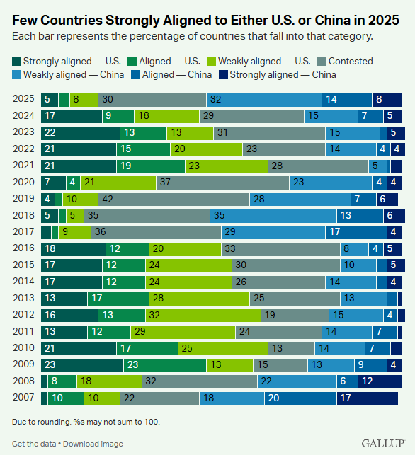 过去二十年美国领导力认知的变化,反映出世界正走向更加多极化的格局。许多国家,尤其是美国盟友,可能更倾向于在主要大国之间保持平衡关系,而不是明确站队。