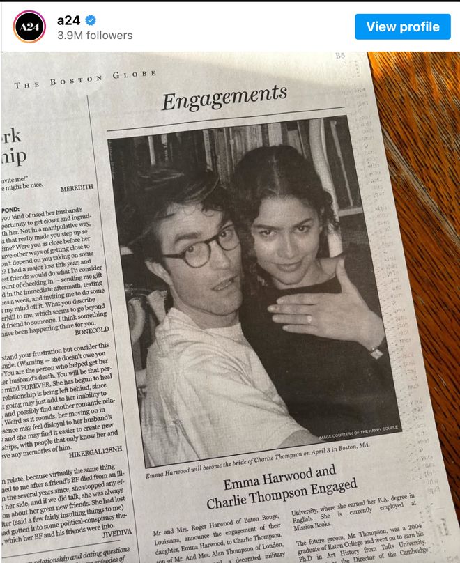 启事上印着“查理”和“艾玛”的生活照,女方手上那枚硕大的钻戒格外抢眼。这两个虚构的人物高调宣布了他们的春季婚礼,日期恰好定在电影正式上映的当天:4月3日。