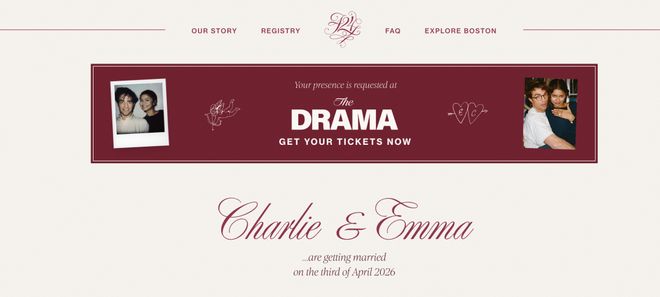 该网站伪装成艾玛和查理婚礼的官网,里面不仅有订婚照、婚礼流程,甚至还有一份波士顿(即电影故事发生地)的旅游指南。此外,该网站还与知名服装租赁平台Nuuly展开了合作。