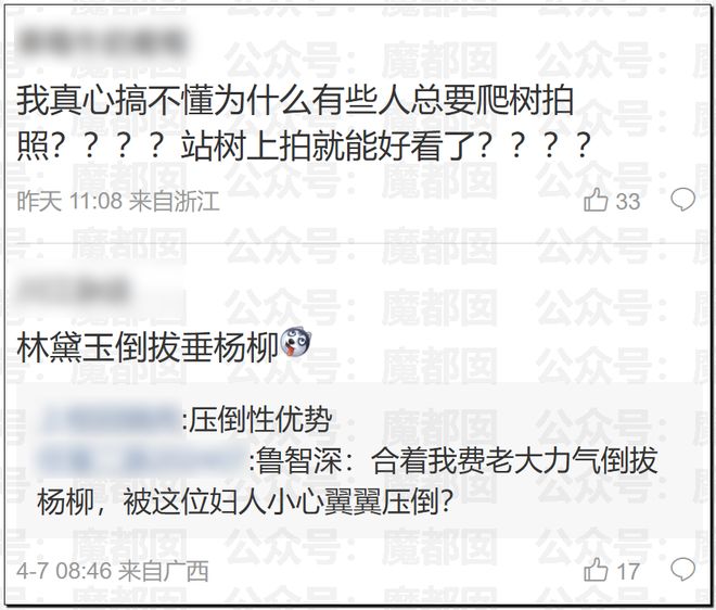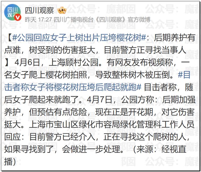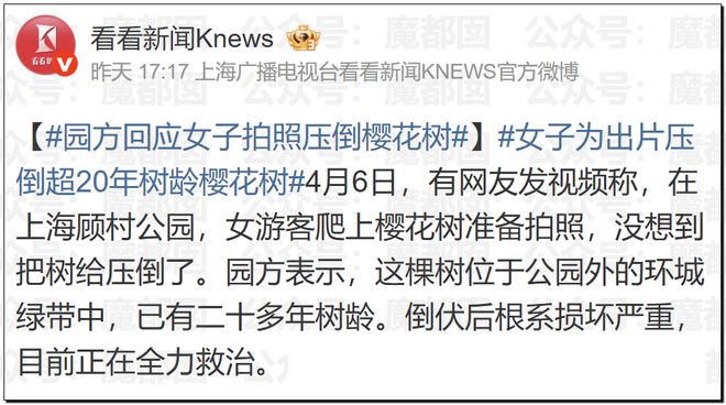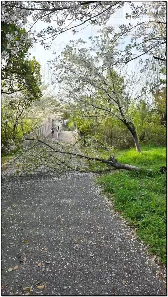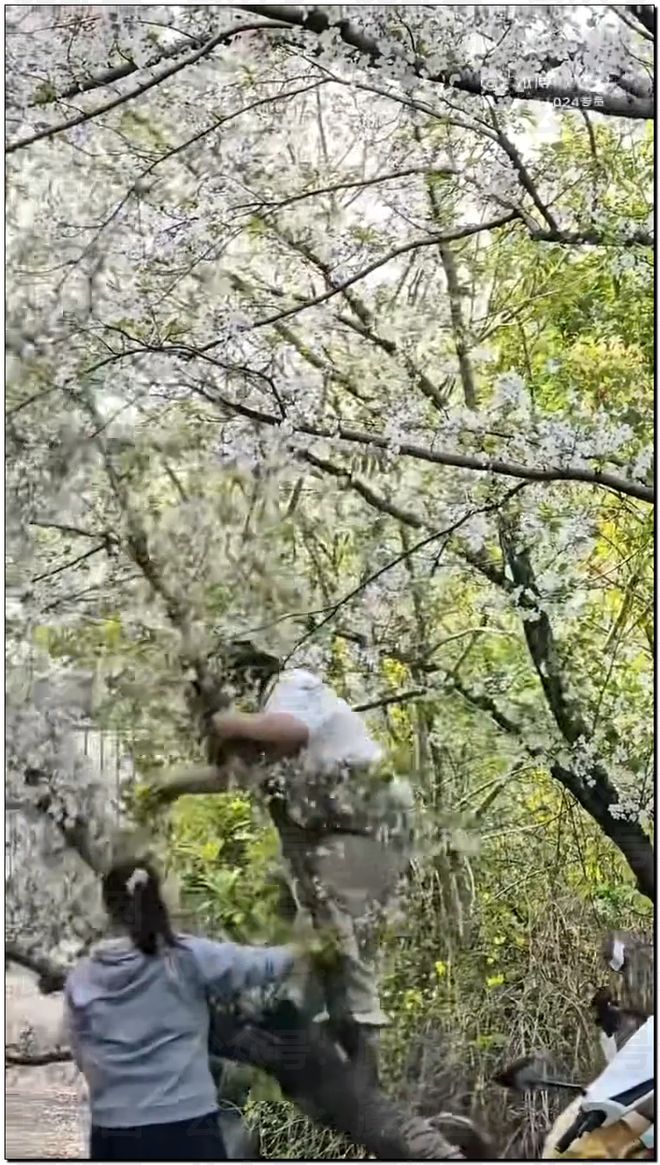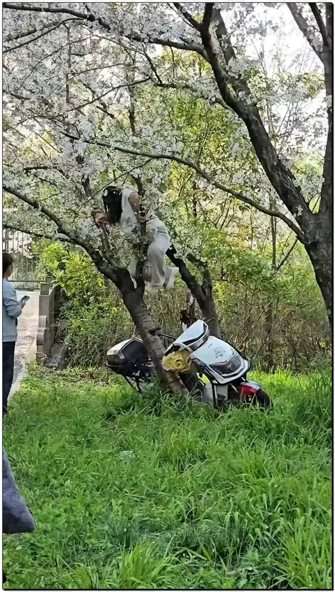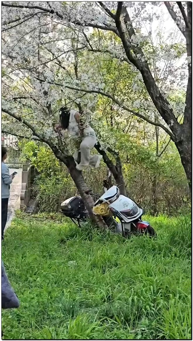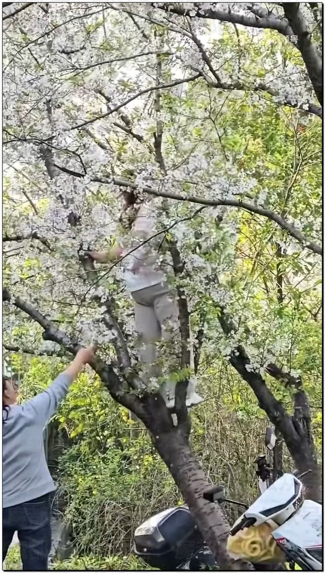 有个女生,我们根据其体型预估体重应该可能达到150斤左右,可能是会为了拍照还是如何,一定要爬上一颗樱花树。