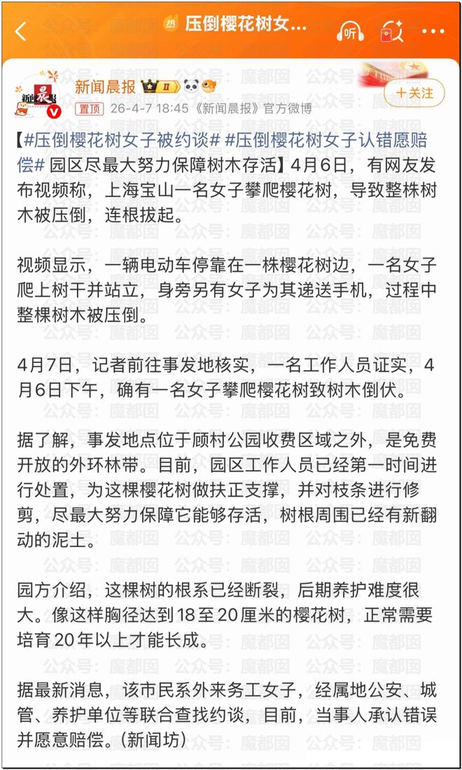 根据媒体报道,这名女子是一名外来务工人员,承认错误并愿意赔偿。