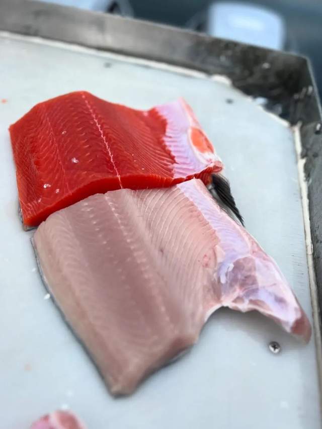 野生三文鱼因为爱吃含有虾青素的甲壳类动物,鱼肉才会变成这种鲜艳的橙红色。上世纪70年代末,瑞士罗氏医药成功实现了人工合成虾青素,很快就被掺进三文鱼饲料里,让养殖三文鱼的鱼肉也能拥有野生三文鱼那样的橙红色。
