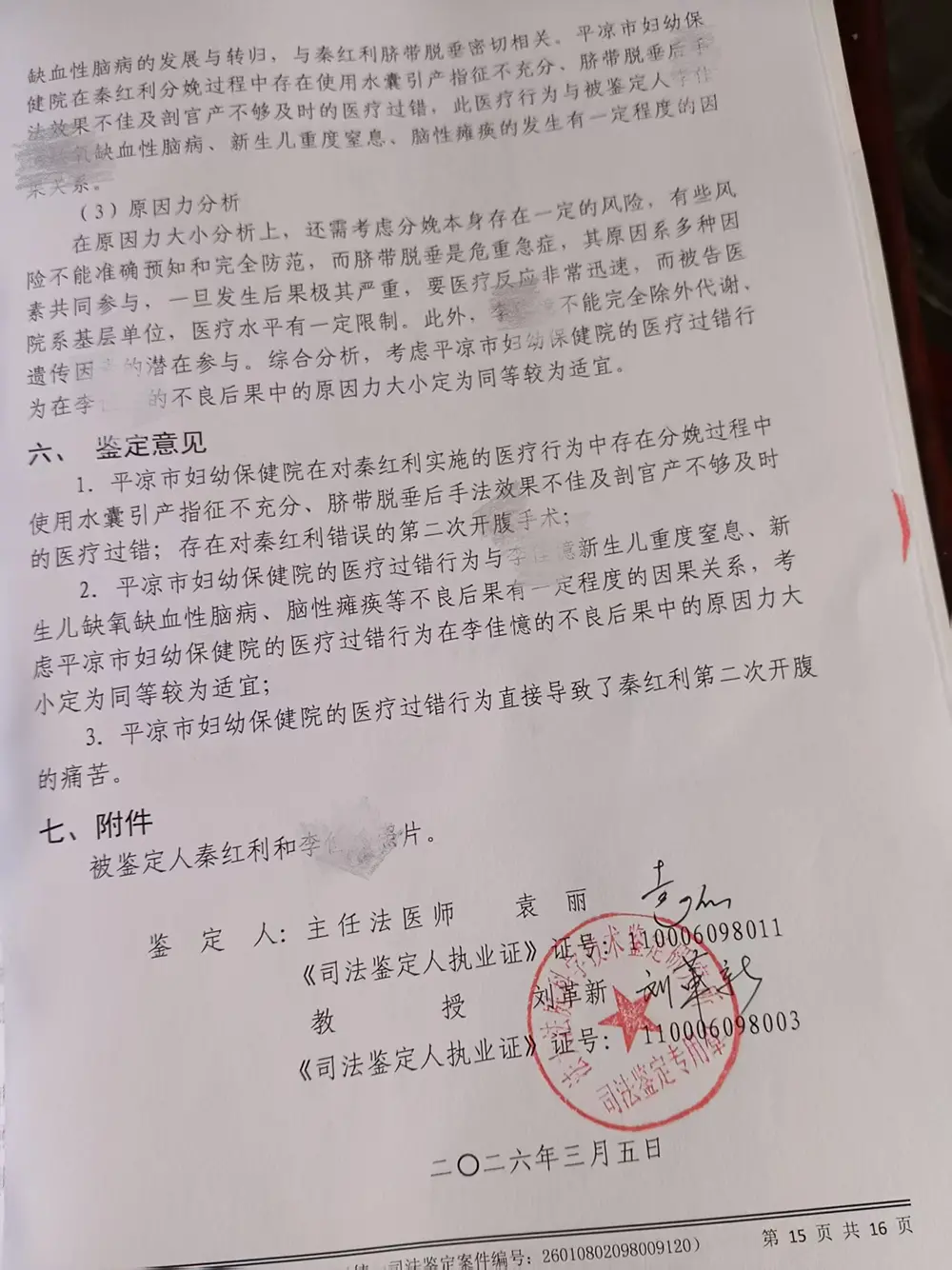 四年后,2026年3月5日,司法鉴定结果显示:平凉市妇幼保健院存在对水囊引产指征把握不充分、脐带脱垂发生后处置不当、剖宫产实施不够及时等多项医疗过错。