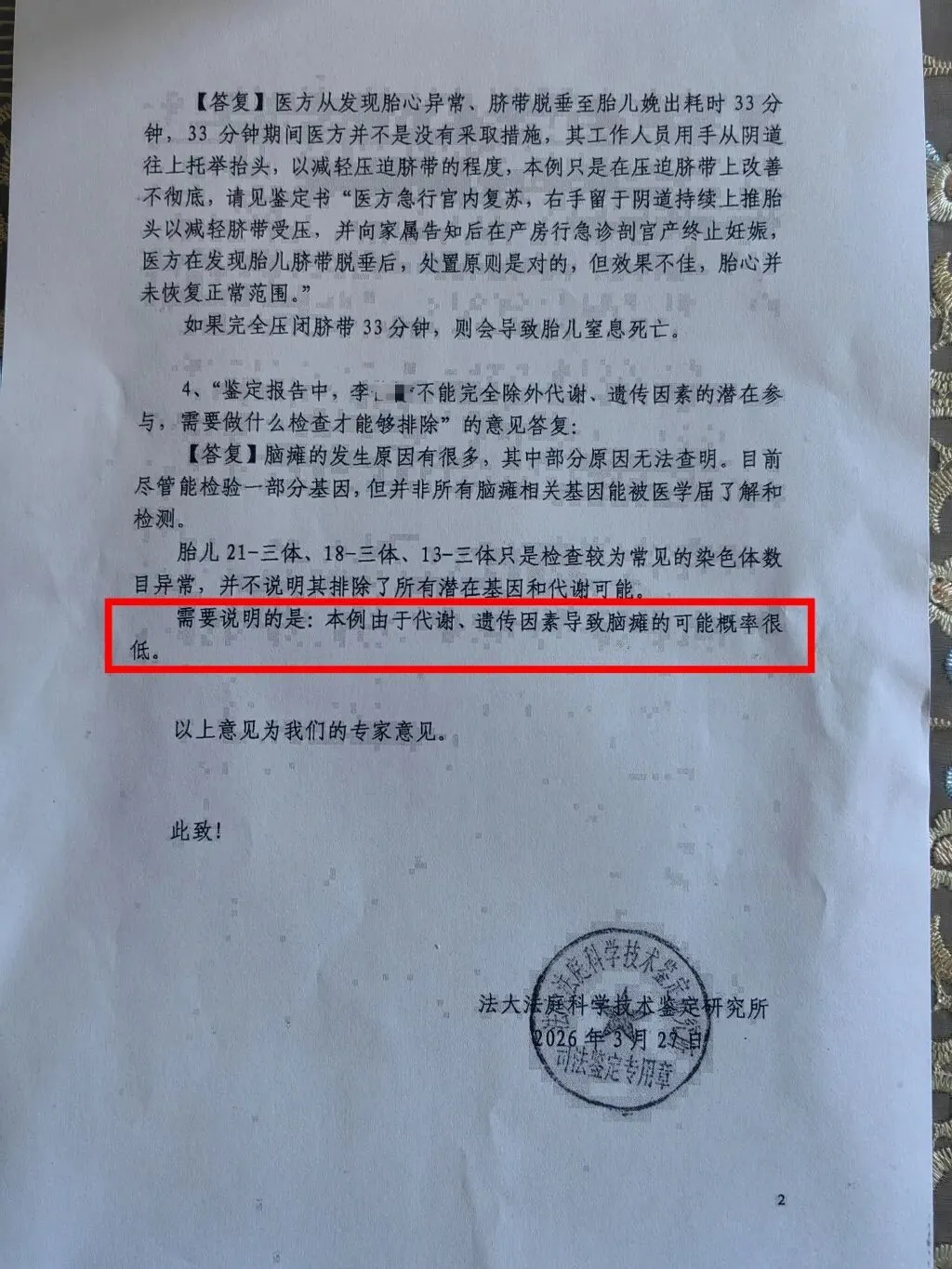 2026年3月5日,法大法庭科学技术鉴定研究所作出鉴定意见书。围绕这起分娩过程中的争议,司法鉴定给出了较为明确的意见。