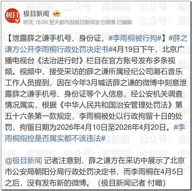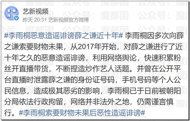 薛之謙方回應,早在2017年,李雨桐及其家人就多次以各種理由向薛之謙索要財物。遭拒絕後,其多次發布針對薛之謙的誹謗性虛假信息,借此博取輿論關注、快速積累大量粉絲,隨後開啟帶貨,並持續炒作與薛之謙相關話題。此類行為性質惡劣,薛之謙方無奈之下選擇報警。經公安機關調查,初步認定李雨桐侵犯薛之謙個人信息權,對其直接作出行政拘留處罰。李雨桐已承認相關違法事實,對處罰無異議,並願意向薛之謙致歉。