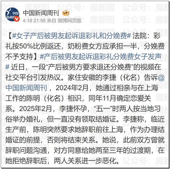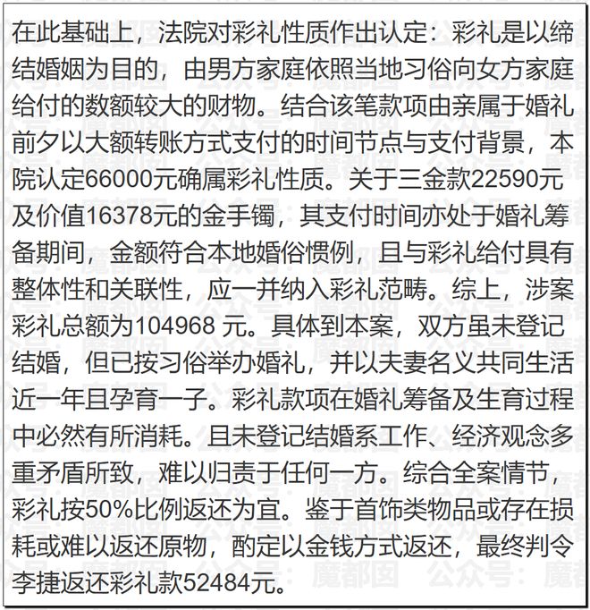 沒想到,對方直接起訴要求返還彩禮、三金和金手鐲,並且要求平分分娩費、月嫂費、奶粉費。法院判決彩禮、三金等返還一半,大約5.2萬,其他費用按照法律規則,進行了裁判(本身也沒多少錢,不是大頭)。