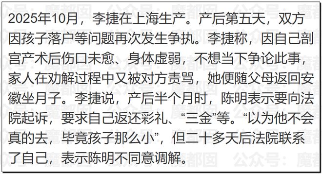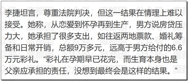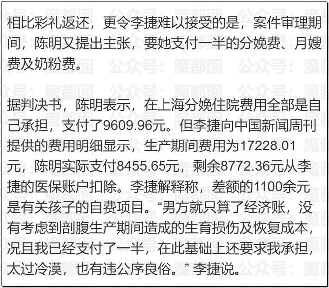 女方向媒體哭訴,說男的只算經濟賬,沒算女方的生育損傷等,覺得太過冷漠,言下之意是感情上有些接受不了。