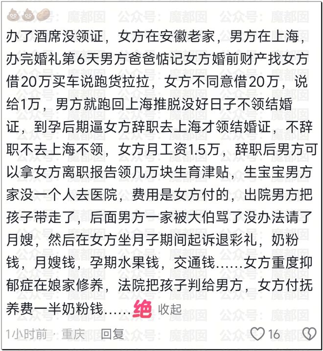 女方覺得彩禮已花完,生育開支是男方應該承擔的事,沒想到會是這樣的結局。從女主的賬號裡我們看到了另外一個版本: