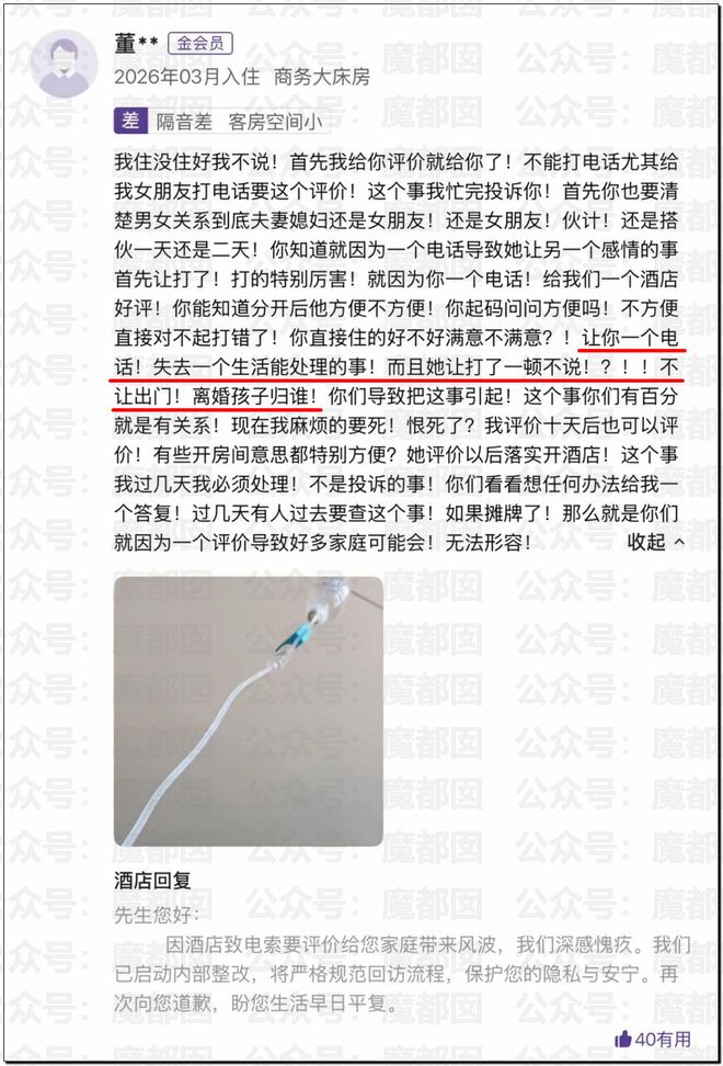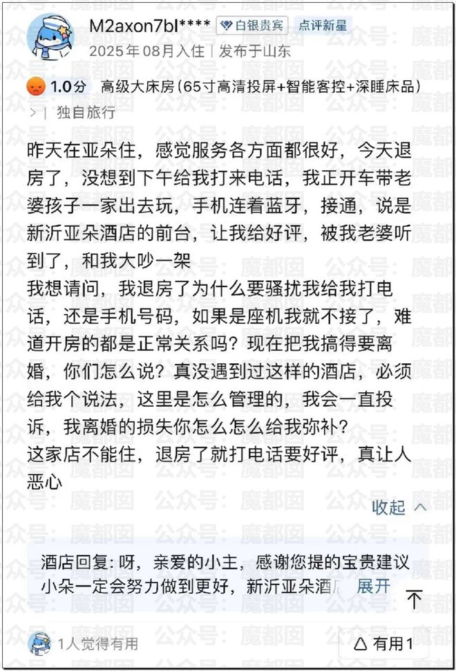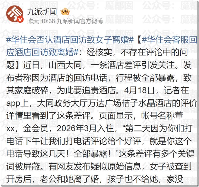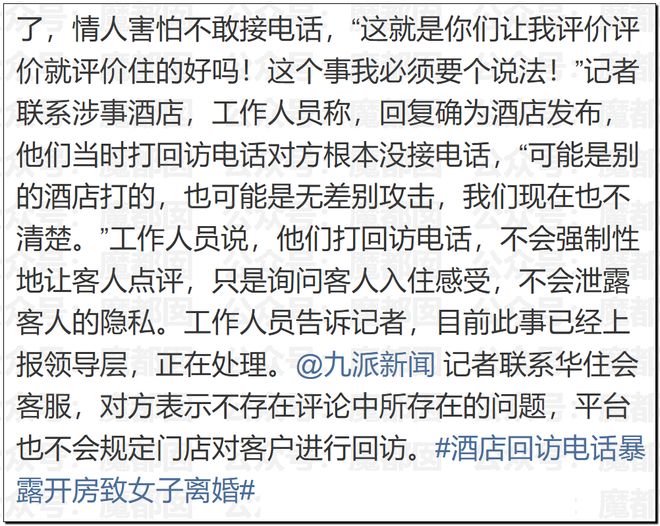 最後說個今天同樣爆紅的事情,近日,山西一家酒店的一條差評引發熱議。發布者稱因為酒店的回訪電話,行程被全部暴露,致其家庭破碎,為此要追責酒店。對此,酒店回應稱,回訪是正常服務流程,且並未接通電話。而且酒店任何回訪電話都不存在脅迫、誘導好評,泄露客人隱私等違規行為。酒店已經就此與相關部門溝通,目前事件仍在核查中。