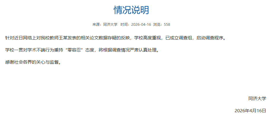 紅星新聞此前報道,記者致電王某論文發表時任職且注明的隸屬機構同濟大學某學院,工作人員表示其已調離。